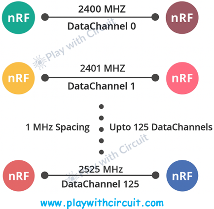 The nRF24L01+ module operates at 2.4 GHz ISM band and sends and receives data within the frequency range of 2.400 GHz to 2.525 GHz. This entire range is divided into segments called channels, each having bandwidth of 1 MHz when the data rate is set to 1Mbps. This gives a total of 126 channels (from channel 0 to 125) that can be used to communicate.